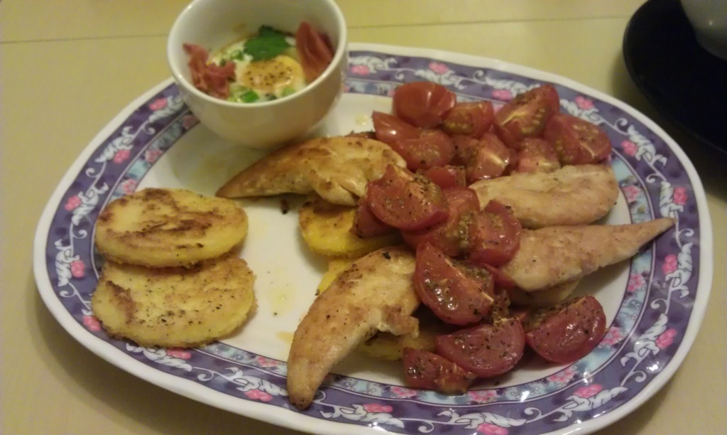 I was thinking of Egg, Polenta and a Chicken salad but I thought that would be too dry. Roasted tomatoes would give the whole dish more moisture and a little more flavour than a salad. I’ve only used Polenta twice before, the first time I used the instant Polenta and pretty much hated it as did my wife. I gave it a second chance, this time buying a proper bag of coarse Polenta maize. It turned out much better, although still not to my wife’s satisfaction. This time, I thought I would do something different and make Polenta fritters so after a quick search on the internet I had a few ideas on how to make it. Unfortunately there seems to be quite a few budding chefs out there that have totally different ideas on how to do it! I largely ended up guessing how it should be done, but I was pleased with the results (and the wife loved it, so it definitely worked out). I also had to guess how eggs were supposed to be baked but I reckoned I could work that one out myself, after all… it’s only baking an egg?